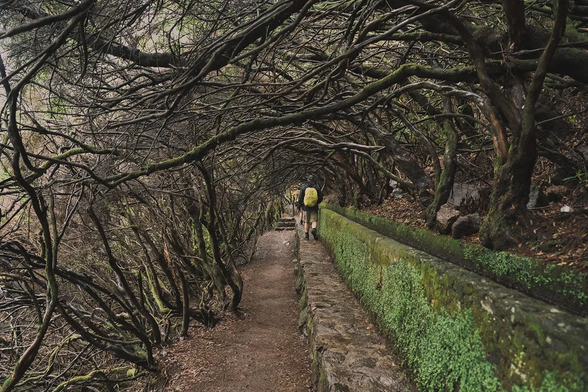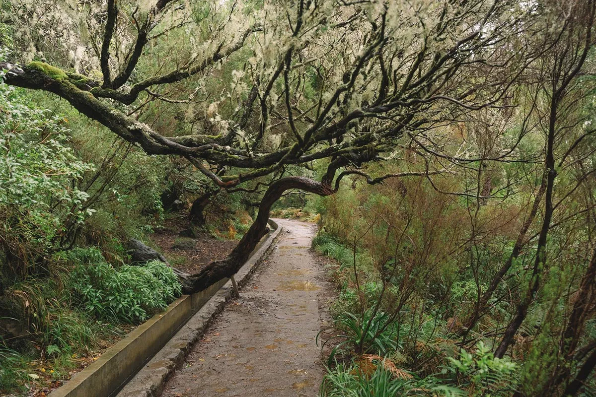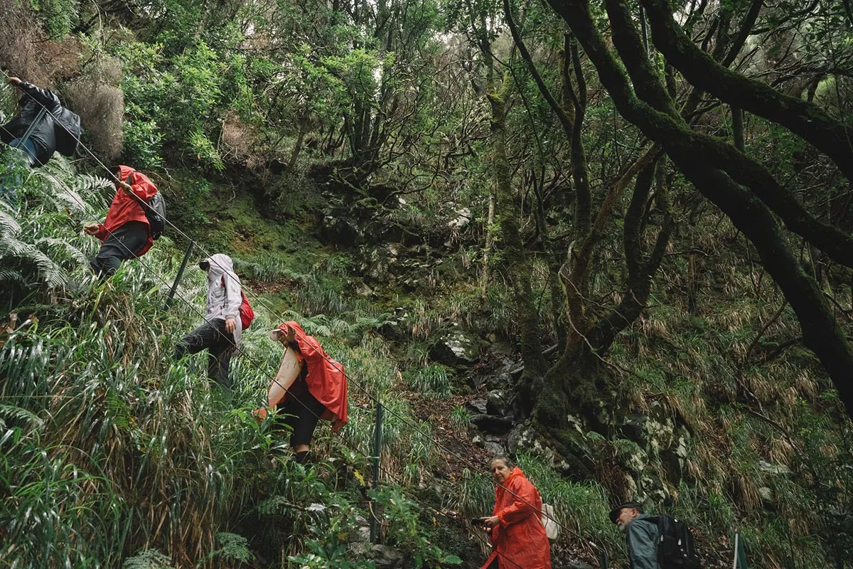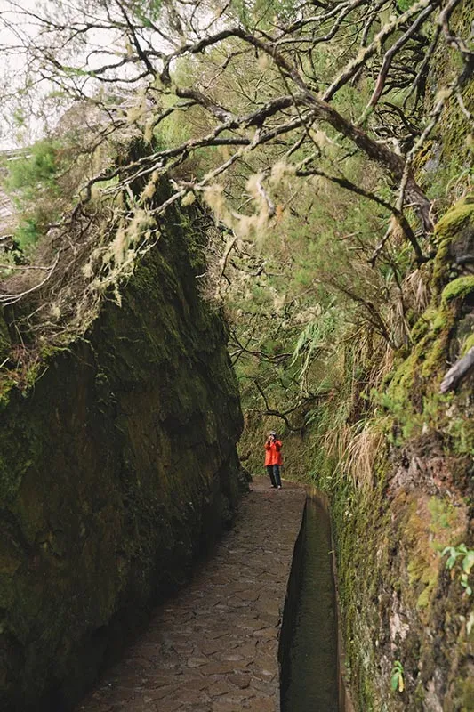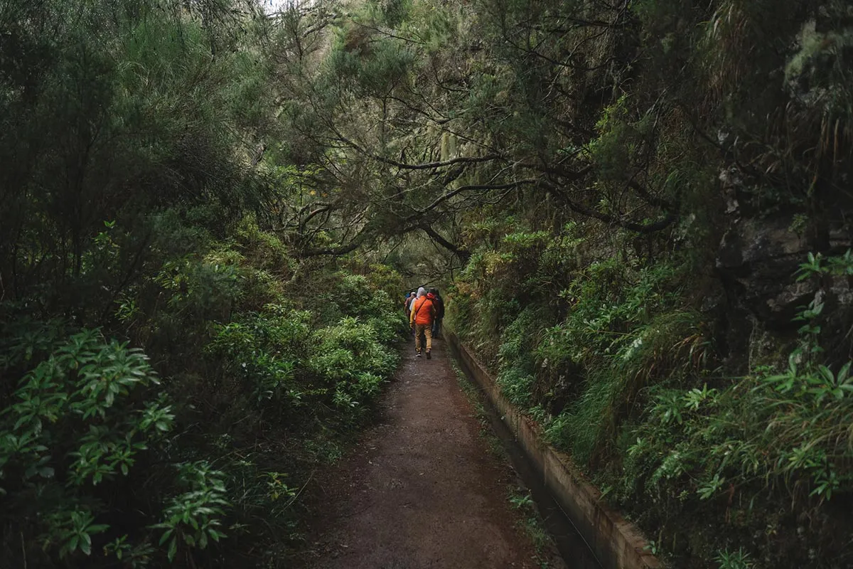 Odata ce am ajuns toti la capatul tunelului, am reluat calatoria, acum in mijlocul unei cete amestecate cu ploaie, cauzata de un nor jos. Am continuat sa urmam levada, intrand din ce in ce mai adanc in verdeata, printre plantatiile frumoase de pini, mimoze si eucalipt, si descoperind mereu soiuri noi si colorate de flori salbatice care cresteau pe malul apei. Intr-un final am ajuns la capatul levadei, acolo unde siroiesc de la mare inaltime mici torenti care se preling pe stancile acoperite de verdeata.