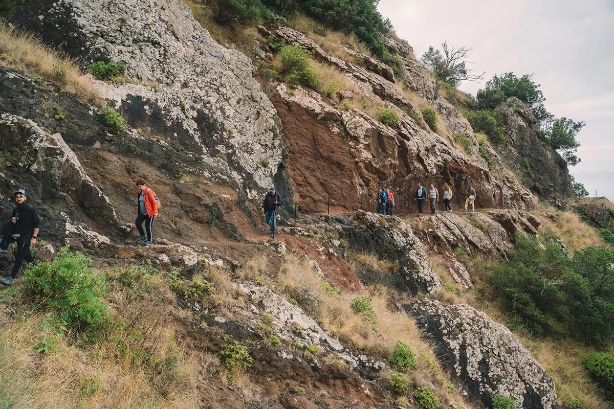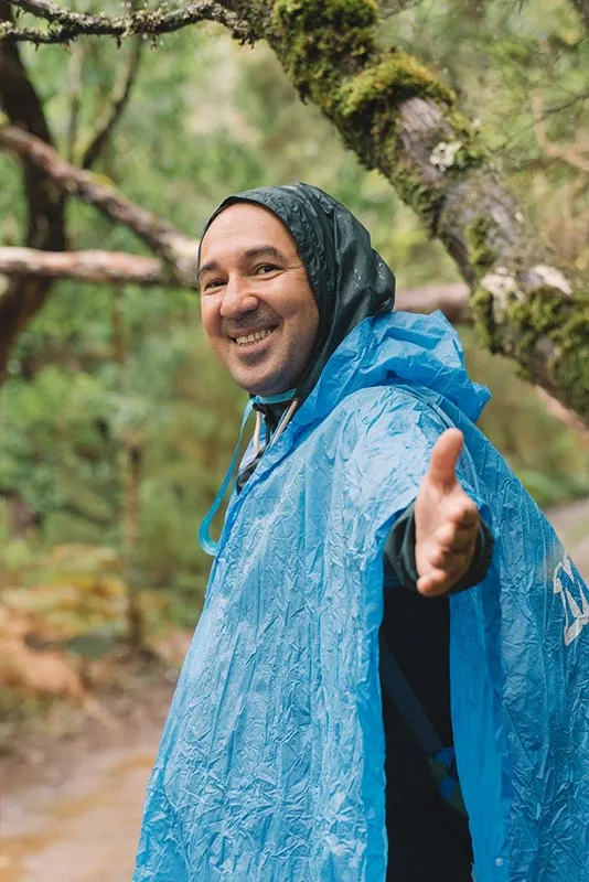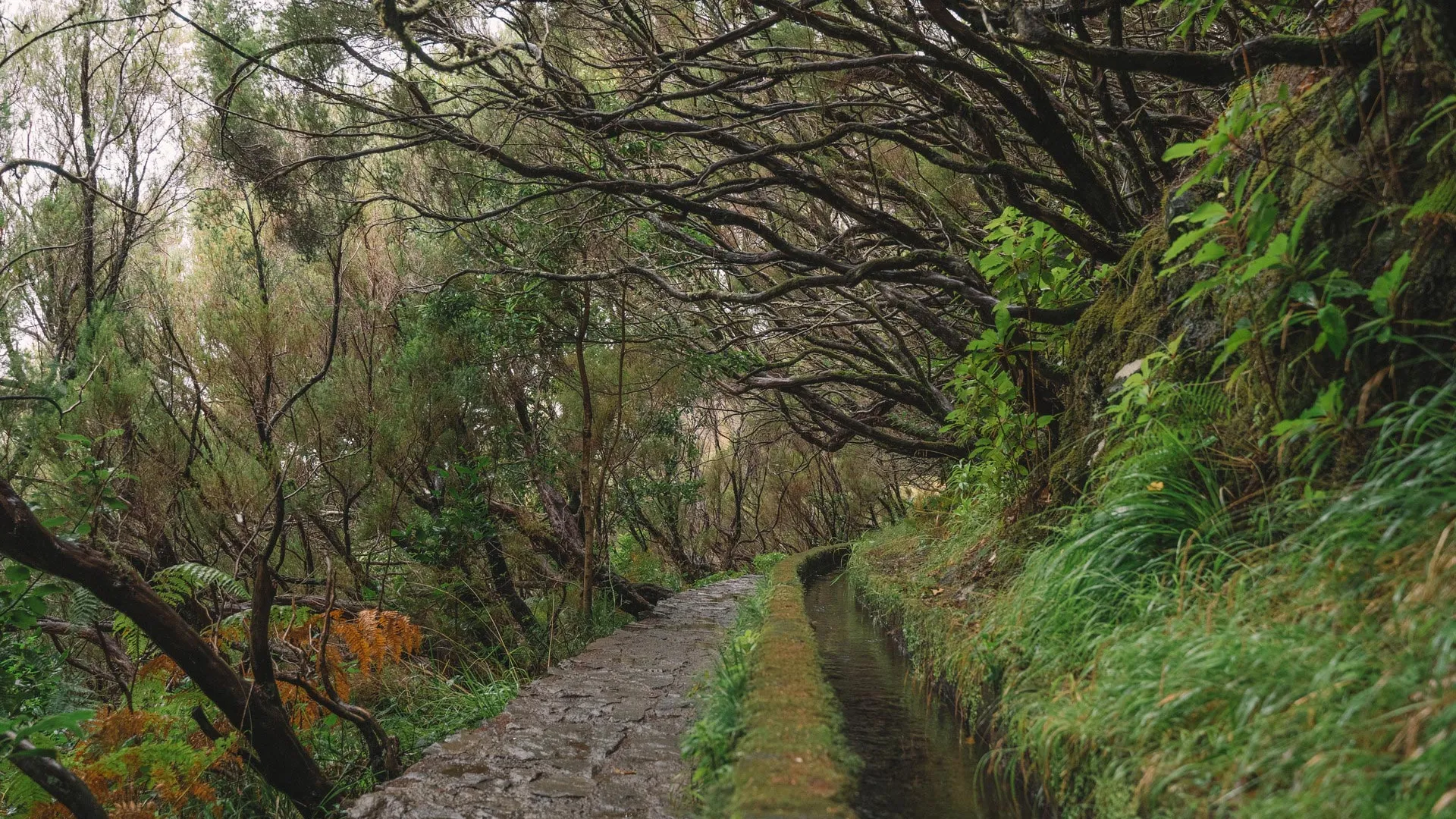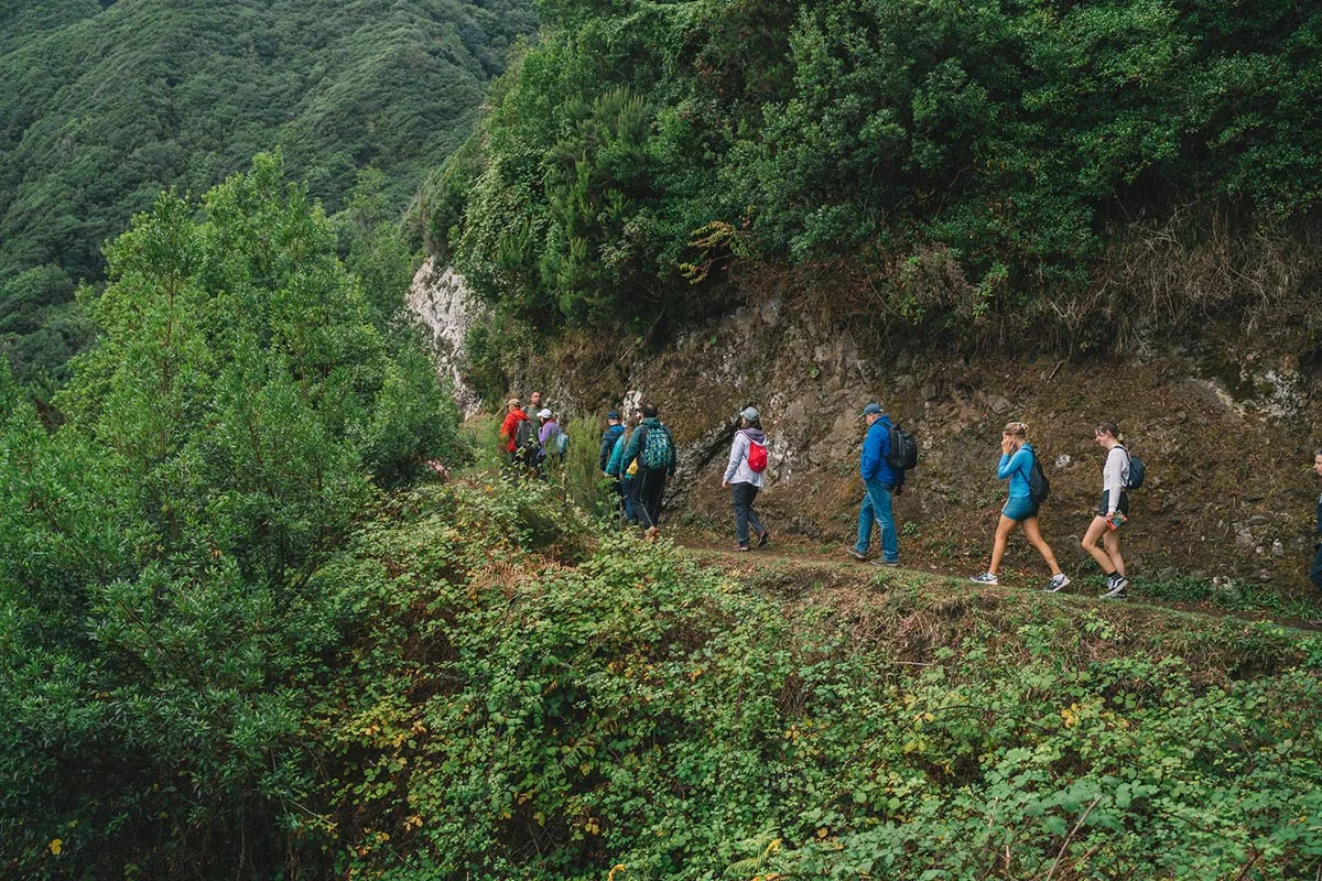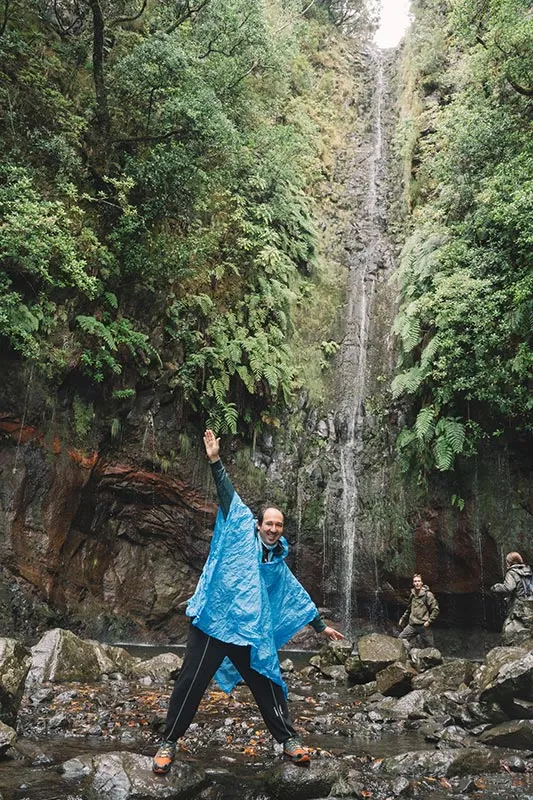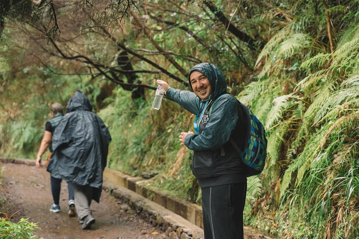 Odata ce am ajuns toti la capatul tunelului, am reluat calatoria, acum in mijlocul unei cete amestecate cu ploaie, cauzata de un nor jos. Am continuat sa urmam levada, intrand din ce in ce mai adanc in verdeata, printre plantatiile frumoase de pini, mimoze si eucalipt, si descoperind mereu soiuri noi si colorate de flori salbatice care cresteau pe malul apei. Intr-un final am ajuns la capatul levadei, acolo unde siroiesc de la mare inaltime mici torenti care se preling pe stancile acoperite de verdeata.