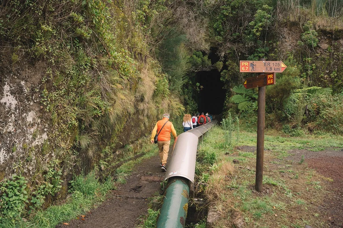 De indata ce am intrat pe traseu, au inceput sa cada ceva stropi insa, iata-ne in fata unui punct cheie al mersului nostru, un adevarat test de hotarare in a ne urmari scopul... ei bine, pe scurt ne-am trezit in fata intrarii unui tunel ingust (avand in vedere ca o buna parte din spatiu era ocupat de levada), cu o bolta destul de joasa, cu peretii denivelati, evident fara iluminare, insa ghidul ne-a oferit lanterne la tot grupul, care s-au dovedit foarte utile, tunelul avand aproape 1 km lungime.
