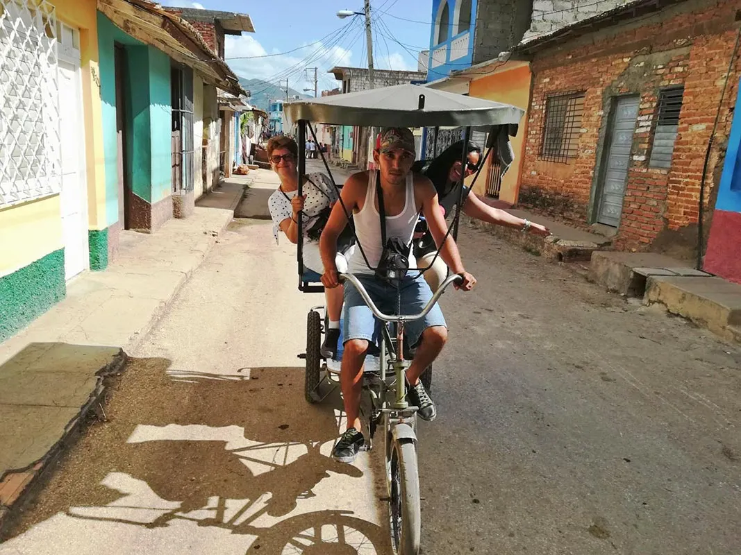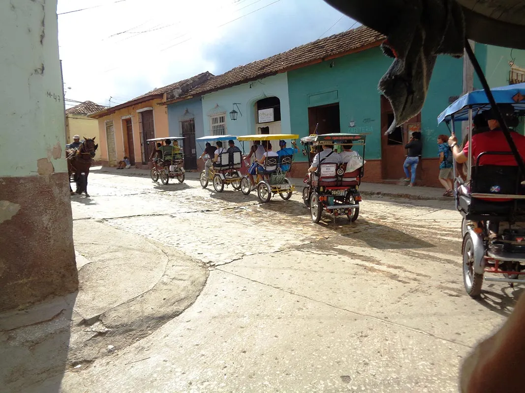 Pestera Indianului si Mural de la Prehistoria cu cea mai gustoasa pina colada au fost punctele turistice din Valea Vinales, pe langa peisajul asemanator celui din Guilin (China), cu mogotes si plantatii de un verde crud (UNESCO) coafate de un curcubeu urias. In drumul spre Trinidad, oras cu case mici, in culori pastelate, unele vechi de 500 de ani, altele cu balcoane din lemn din secolul 18 si altele cu balcoane din fier din secolul 19, cu grilaje la geamurile inalte aproape cat usa (caracteristica a arhitecturii in Trinidad) si strazi inguste cu pavaj de piatra, bici-taxi si sarete (UNESCO), ne-am oprit si in golful Caraibelor in Cienfuegos pentru a admira frumosul teatru Tomas Terry, unde au cantat Enrico Caruso si Sarah Bernhardt. De remarcat ca cei ce detineau averi importante construiau TEATRE, pentru muzica si dans, palate (Palatul de Valle - o adevarata bijuterie arhitecturala) si mai putin biserici cum se practica in alte parti... Se spune ca Trinidadul e locul de nastere al cha cha cha, si desigur ca si aici, ca oriunde altundeva in Cuba, oamenii canta si danseaza peste tot, iar seara, dupa ce se mai domoleste caldura, localnicii si turistii se bucura de muzica si dans la Casa de la Musica sau in tot felul de bodegi. In piata centrala e singurul loc unde ai internet wi-fi si toata lumea sta pe scari si razuieste la cartele de internet, ca la loz in plic... nimic nu ii distrage de la aceasta activitate... concentrarea trebuie sa fie maxima pentru a folosi cat mai eficient timpul oferit de cartela preplatita.