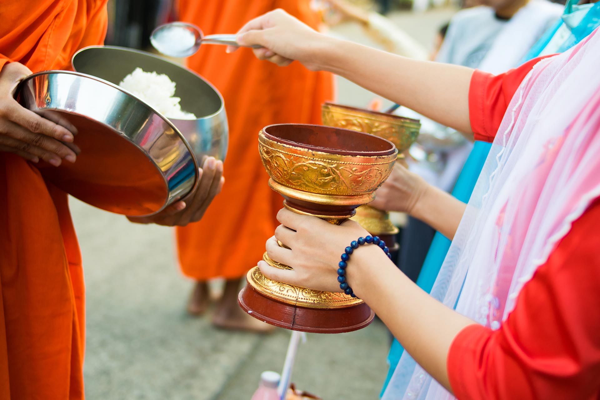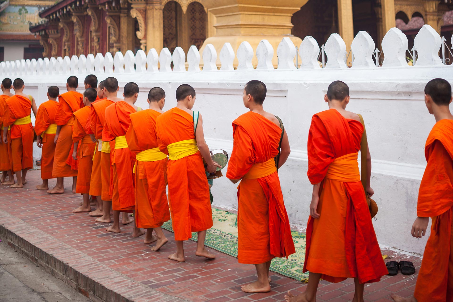 Tak Bat este ritualul hranirii calugarilor in Laos si reprezinta una dintre cele mai importante si respectate traditii din tara. Este o practica zilnica de daruire si recunostinta intre oamenii din comunitate si calugarii budisti. Ritualul are loc in fiecare dimineata, la rasaritul soarelui, in jurul orelor 05.30 - 06.00. Se ofera orez lipicios proaspat gatit, fructe, biscuiti, etc. Credinciosii se aseaza in genunchi sau in pozitie sezand, de-a lungul strazii, in tacere, cu vasele cu mancare pregatite. Ceremonia incepe cu loviturile de tobe care anunta venirea calugarilor. Acestia apar desculti, imbracati in robe portocalii, in sir ordonat, de la cel mai in varsta la cel mai tanar, si poarta boluri de milostenie numite bat, unde credinciosii pun portii mici de mancare. Totul se desfasoara intr-o solemnitate aparte, fiecare ofranda fiind insotita de o rugaciune tacuta, o dorinta de pace, bine si recunostinta.