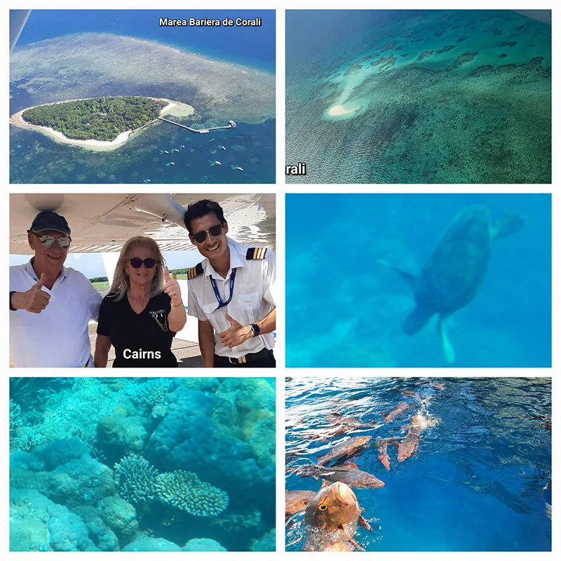 Dupa cateva zile petrecute in Sidney, am pornit spre Cairns, unde ne-a asteptat Razvan Pascu, sa zburam si sa ne scufundam la Marea Bariera de Corali, una dintre cele mai mari structuri vii de pe planeta, vizibila din spatiul cosmic. Pentru mine, experientele traite la Marea Bariera de Corali sunt unice, din avion si de sub apa, totul este magnific. Poti face cunostinta cu varietatea uimitoare de vietati marine - corali, pesti tropicali, delfini, rechini, testoase, scoici - prin diving si snorkeling, care sunt spectaculoase, sau admirandu-le de la statiile de observare subacvatice si din minisubmarinele din sticla.
