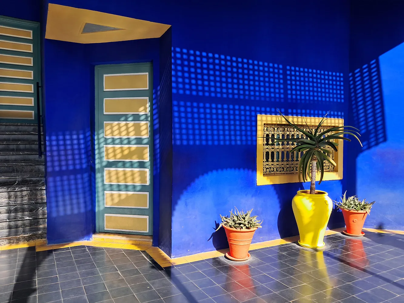 - Les Jardins Majorelle, unde poti admira cladirile vopsite in faimoasa nuanta de albastru Majorelle si unde cararile te duc printre peste 300 de specii de plante exotice