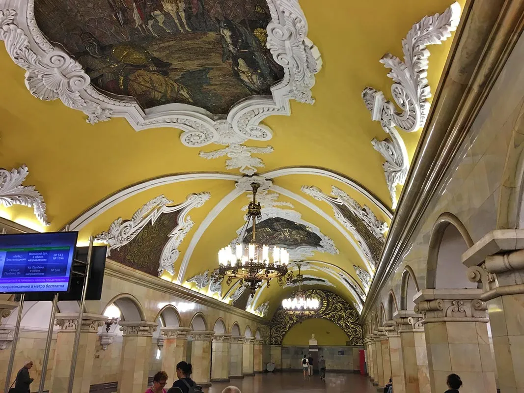 Statiile de metrou construite in anii '30, in timpul lui Stalin, sunt adevarate opere de arta, zici ca patrunzi in niste palate. Iata lista celor mai frumoase statii, in caz ca ajungi la Moscova: Kievskaya (dedicata Ucrainei, a carei constructie a fost supervizata de Hrusciov, pe atunci prim-secretar al RSS Ucrainene), Ploschad Revolutsii (cu 76 de statui de bronz ale oamenilor muncii), Mayakovskaya (probabil cea mai frumoasa, avand si un aer futurist pentru anii '30, voind sa sugereze viitorul de aur al Uniunii Sovietice), Prospekt Mira (zici ca te afli in palatul tarului, cu candelabre atarnand deasupra peroanelor), Komsomolskaya (welcome to Versailles-ul statiilor de metrou). Alte statii care merita vizitate sunt Arbatskaya, Beloruskaya si Novoslobodskaya. Urmatoarea zi, a continuat cu o vizita la Galeria Tretyakov, cel mai vizitat muzeu din Moscova, fiind cunoscut in lumea intreaga. In interiorul institutiei, pasionatii de arta pot admira colectii intregi de picturi, sculpturi, grafice si desene ale celor mai importanti artisti rusi, o biblioteca cu carti si manuscrise antice, documente si fotografii vechi care ne infatiseaza vechea Galerie Tretyakov, precum si magazine de unde putem cumpara copii ale operelor care se gasesc aici. Departe de a epuiza obiectivele turistice ale unui oras care nu traieste din turism, permiteti-mi sa va recomand zona cea mai buna pentru cumparaturi, in special suvenire: Strada Arbat, mereu animata, unde se poate cu usurinta gasi cate ceva pe gustul fiecaruia.