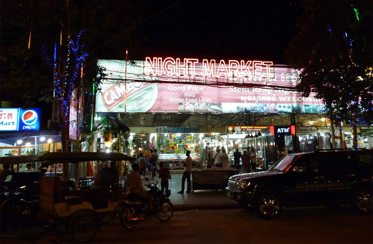 Dupa cina, m-am dus cu ghidul in tur de noapte. Ne-am plimbat in zona Night Market, care este oarecum similara cu ceea ce se intampla in alte tari din Indochina. Exista Original Night Market si Night Market, ambele sunt oricum in aceeasi zona si ambele sunt compuse din genul de tarabe cu tot felul de suvenire, saloane de masaj in strada, tuk tuk-uri peste tot, oameni care vor sa iti vanda cate ceva, o atmosfera frumoasa si exotica. Tot in zona se afla si Pub Street. Este o strada cu o lungime de aproape 200 de metri, cu restaurante si baruri pe stanga si pe dreapa. Din strada, se lasa stradute cu alte tarabe; tot in zona se afla si multe spa-uri. Atmosfera este cu adevarat exotica, se aude muzica de peste tot, oamenii sunt veseli. Atat in Night Market, cat si pe Pub Street activitatea incepe pe la 18:00, se termina pe la 23:00 in low season si in jur de ora 1:00 in high season.