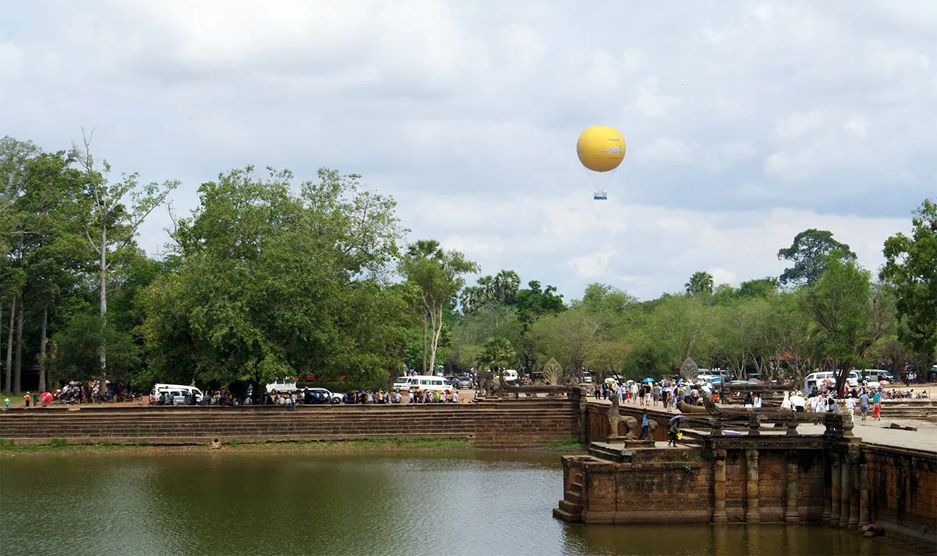 In dimineata ultimei zile petrecute in Siem Reap, m-am trezit devreme, cu ochii lipiti, pentru a vizita templele. Mai intai, m-am dus la celebrul balon care costa 15$. Balonul in sine este o panorama, legat cu un cablu de sol. Se ridica vreo cinci minute la o inaltime de circa 300 de metri, sta acolo zece minute si apoi coboara. Se vad Angkor Wat si Angkor Thom, dar dimineata esti cu soarele in ochi, deci nu prea vezi mare lucru. Nu recomand.