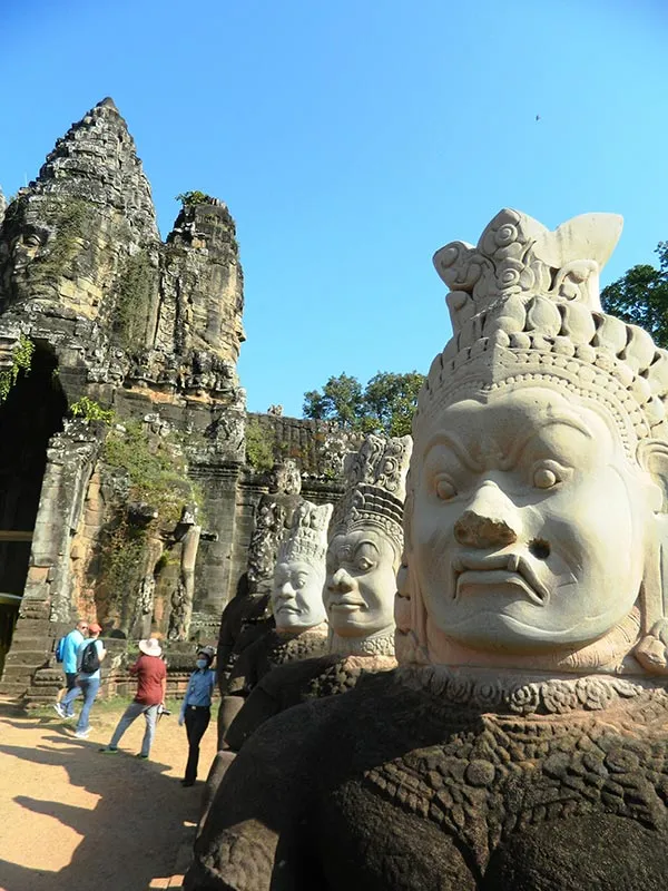 Dupa doua zile in Saigon, ne indreptam catre Cambodgia. La iesirea din micutul aeroport din Siem Reap, ne asteapta zambitoare ghida noastra pentru urmatoarele trei zile. Aceste zile sunt pline de emotii, culoare, natura, arhitectura, misticism, istorie si lista poate continua. Fie ca esti sau nu pasionat de istoria religiilor, nu ai cum sa nu ramai impresionat de complexul Ankor. Incepem incursiunea cu Angkor Thom, ultima capitala a imperiului Khmer. Intram pe Poarta de Sud, cea care, de-a lungul timpului, s-a pastrat cel mai bine. Apoi, ajungem in centrul vechiului oras unde se ridica Templul Bayon. Constructia are 54 de turnuri - unul pentru fiecare provincie a Imperiului Khmer din acea vreme - iar fiecare turn are cate patru fatade cu chipuri sculptate. Pana astazi, templul a ramas o enigma. Cele 216 capete colosale care zambesc misterios vizitatorului, au dat nastere numeroaselor discutii despre divinitatea care patroneaza templul.