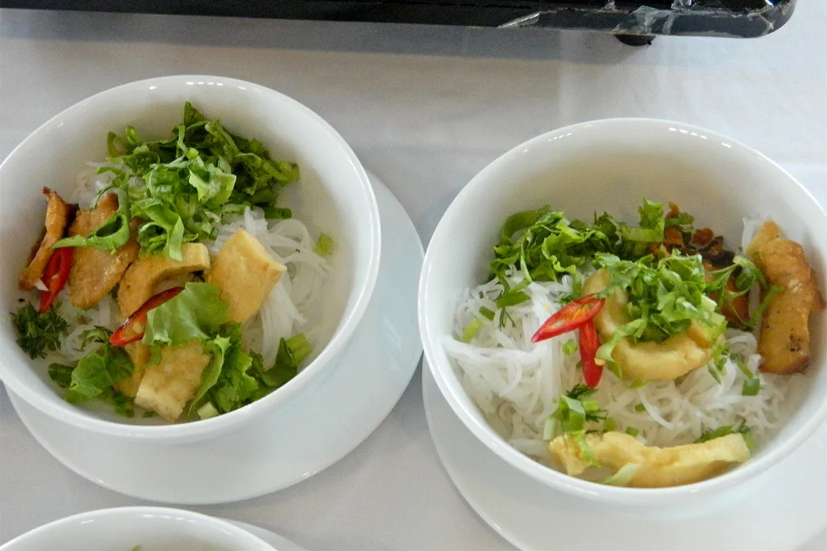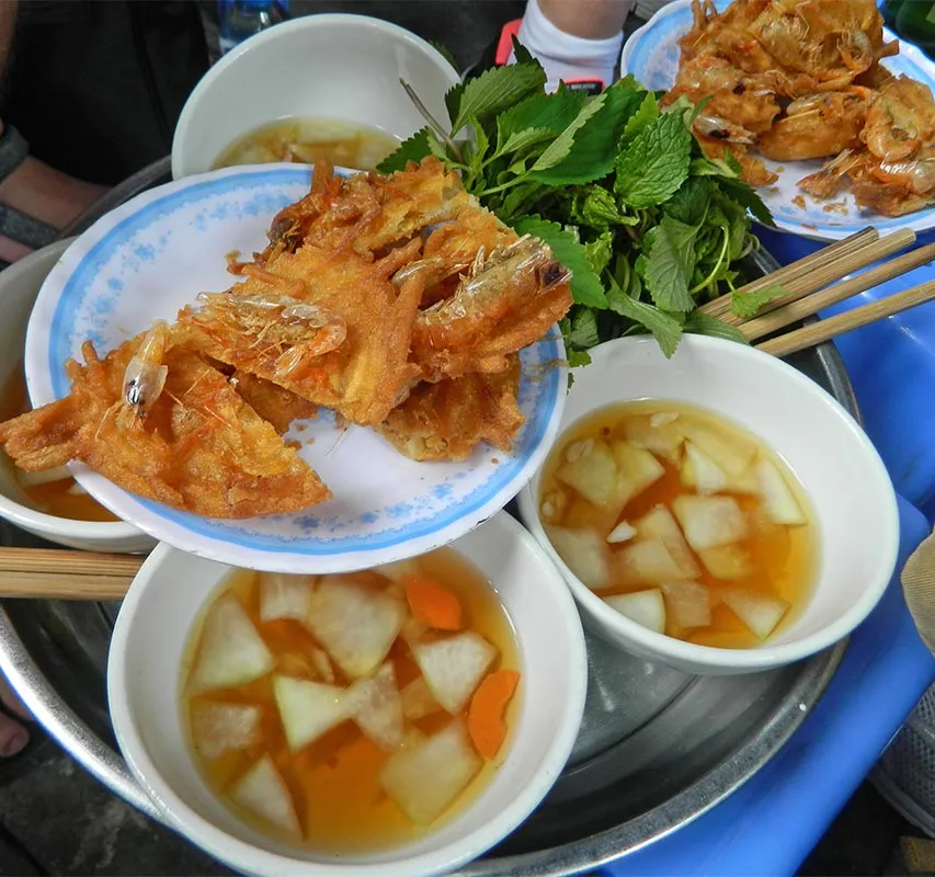 In dimineata zilei urmatoare, am pasit in agitatia orasului pentru un mic dejun traditional pe stazile aglomerate si colorate. O omleta pregatita pe marginea trotuarului, cu oua proaspete si verdeata, asezonata cu un sos putin picant. Au urmat apoi paste de orez si nem (spring rolls) cu carne de pui, prajite in ulei de palmier; toate insotite de ierburi de tot felul.